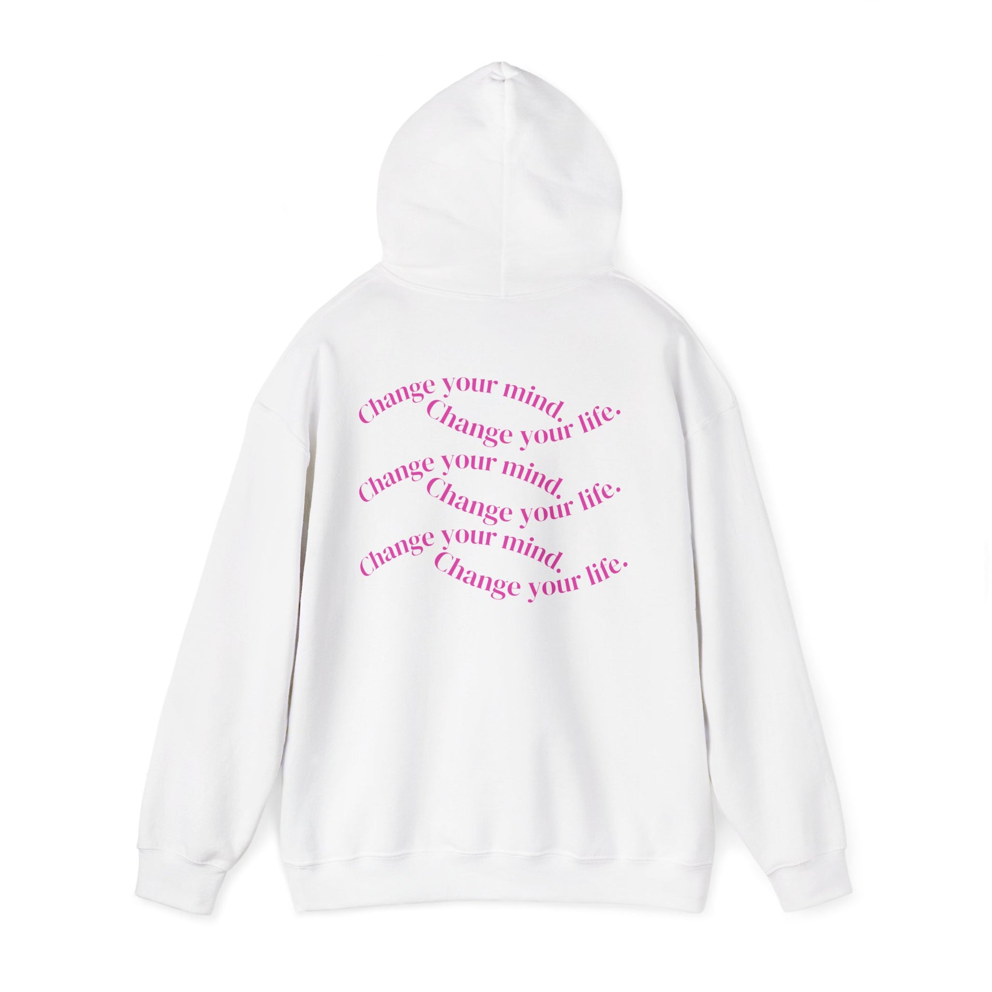 Soft, warm, and quietly bold — this hoodie carries a playful, intimate message in a gentle palette. The front pairs chunky pink type with a small, empowering graphic, while the back echoes a mantra in curved, whispering lines. It feels like a friend who nudges you to shift your mindset: cozy enough for slow mornings, confident enough to wear out. Layer it over loungewear for days spent home, or pair with jeans and boots when you want an effortless statement. The roomy kangaroo pocket and double-lined hood add comfort; the fabric holds prints with a smooth finish and keeps its shape through many wears. This is clothing that speaks softly but stays with you.